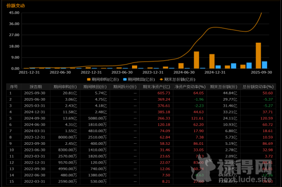 做投资的人经常讲主力资金,转债的主力在哪里呢?市场上有两只转债ETF,分别是博时511380、海富通511180,目前披露的持有人结构中98%以上被机构持有。其中511380的规模从去年的266亿增加到今年9月的605亿。下图为:截止2025年9月30日,511380份额: