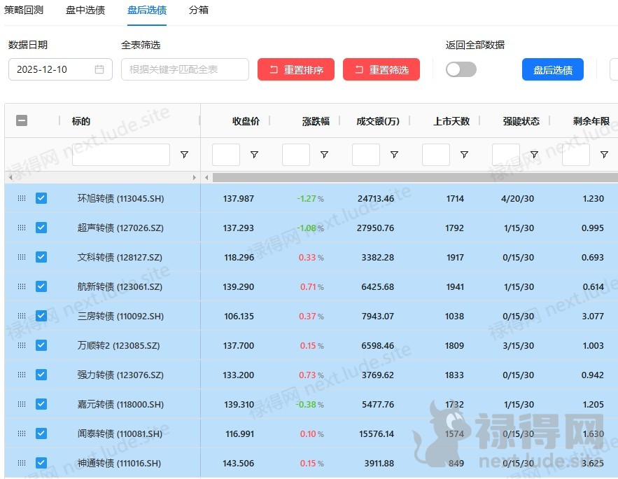 这几天刚开始实盘QMT,但是发现盘中选债和盘后选债还是有差异的。如果盘后选债和每天的回测是相关的,那么大家最好把可转债保持在10左右,甚至更多。因为实盘交易,都是盘中选债,所以在14:45:00左右买入的,和收盘价是完全不一样的策略。这是现实的局限,也是无奈。我曾经捣鼓2到3只算是比较牛的夏普率达到2.5左右的策略,但都是5只可转债甚至是4只和2只的。盘中选债和盘后选债的不一样是致命的,但凡出入2到3只偏差,对于只有5只以内持仓的都是巨大的偏差。
