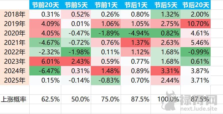 再看远一点节后20天也只有2022年是-0.99%,其余年份都是上涨的,且除了2023年只涨了0.61%,2018年2%,其余几年上涨都不算少,3.7%起步,最高10.7%。
