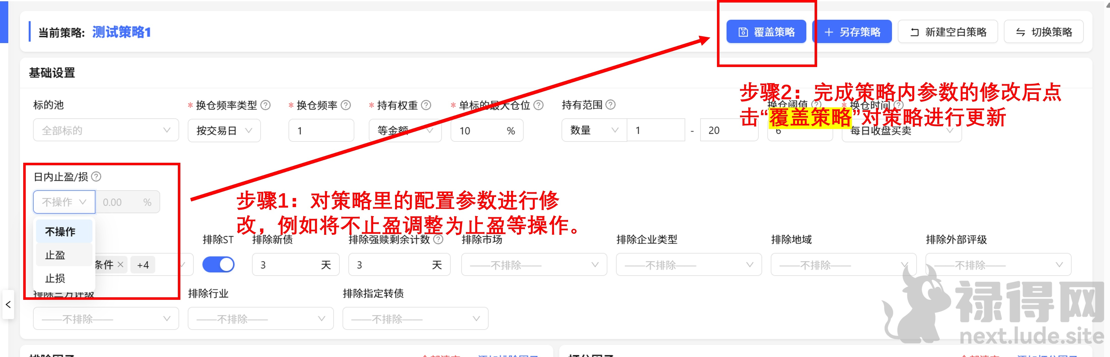 更新策略配置里的参数,修改完后点击“覆盖策略”按钮,用新的参数覆盖旧参数。