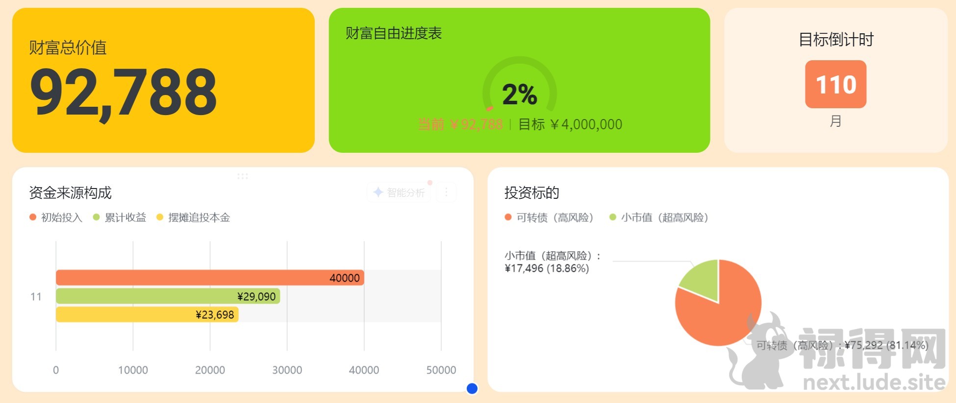 挑战规则: 1)初始本金 2 万 2)不使用主业工资 3)目标:10 年做到 400 万